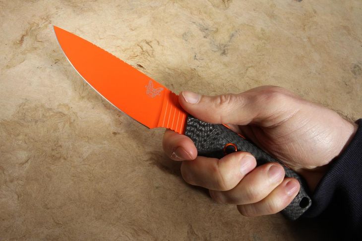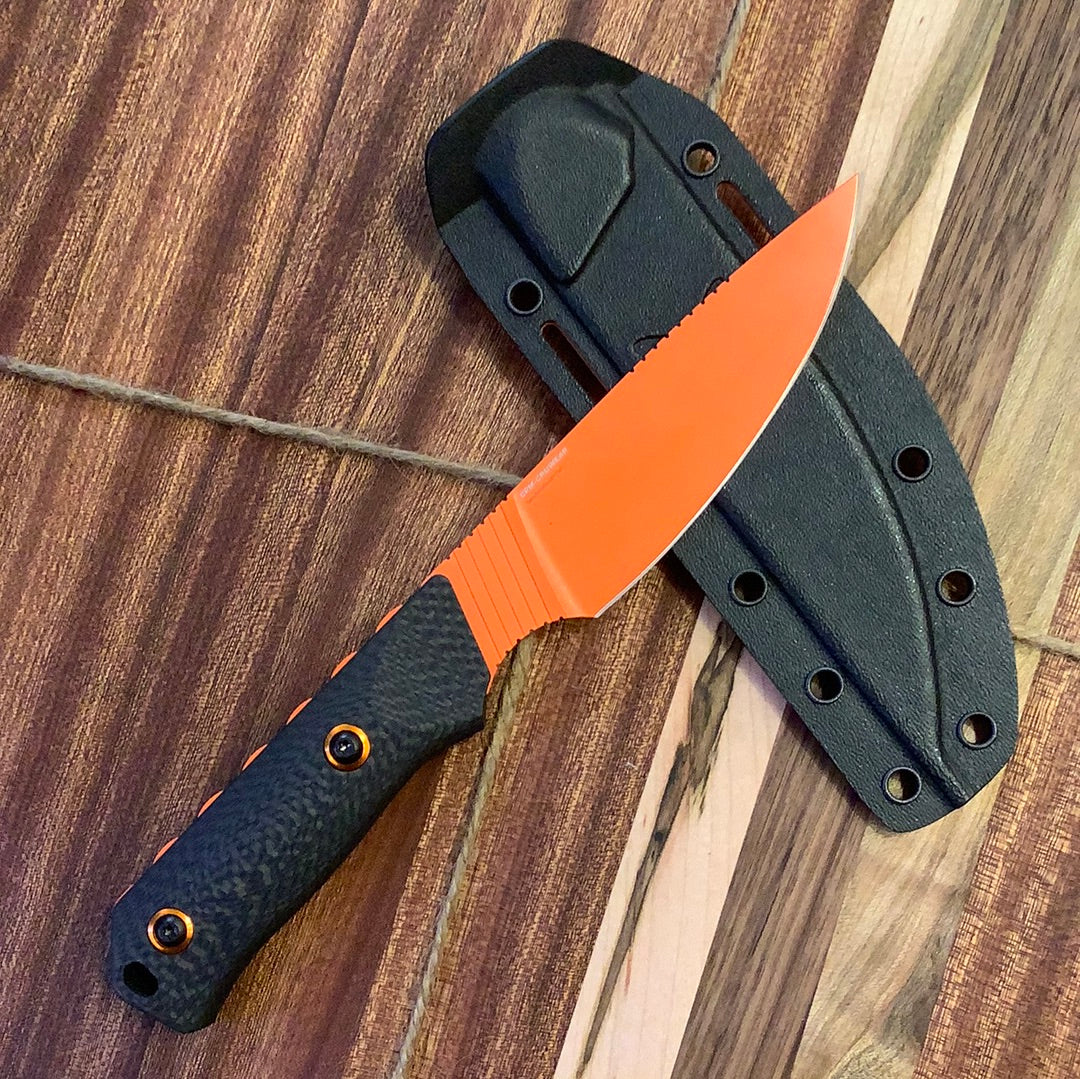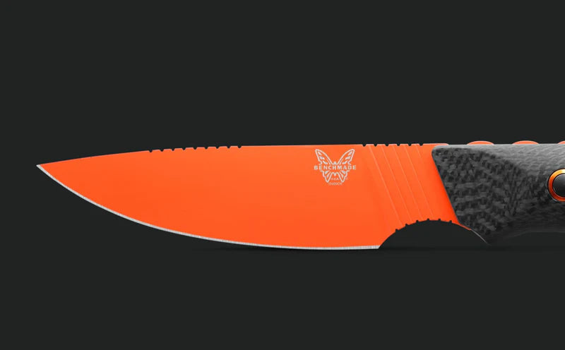 The handle scales are carbon fiber which are attached to the full tang with orange anodized collars. The spine of the blade is notched to allow a positive grip for good control when the knife is in use.