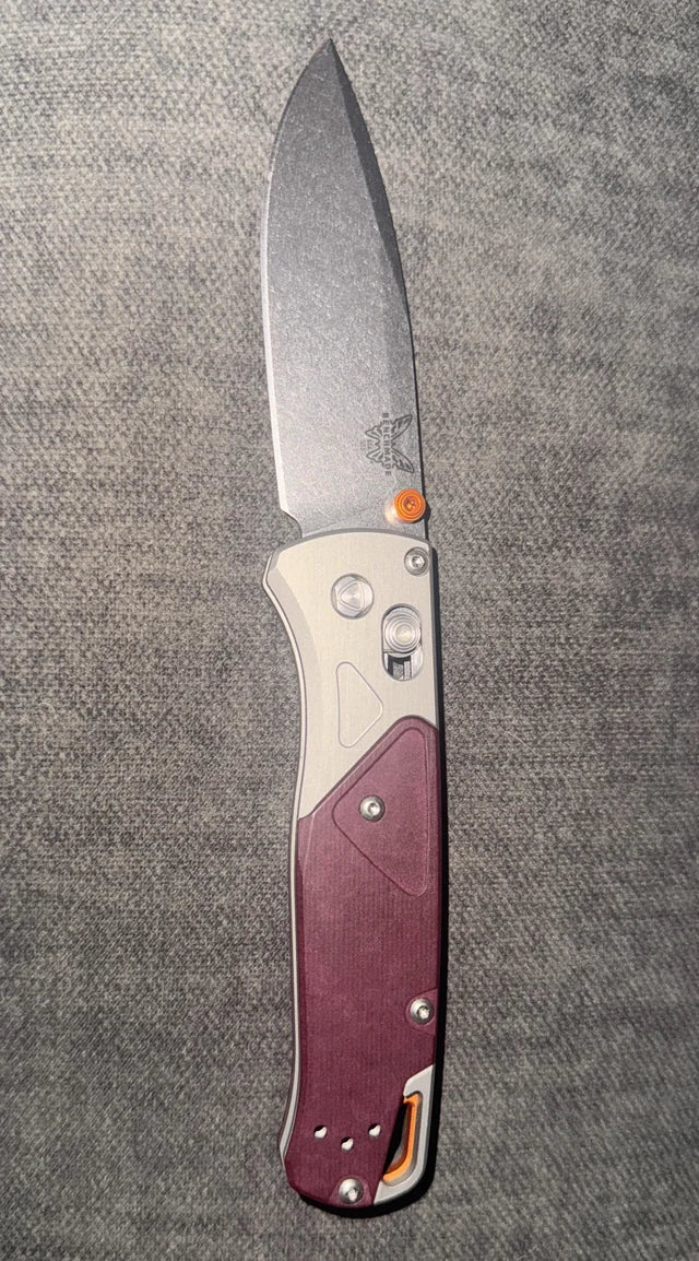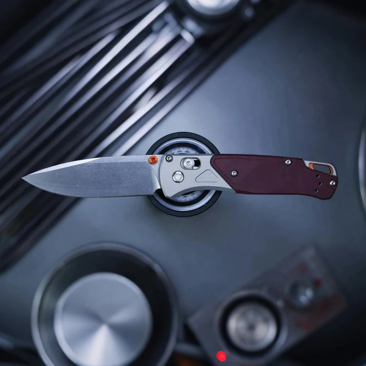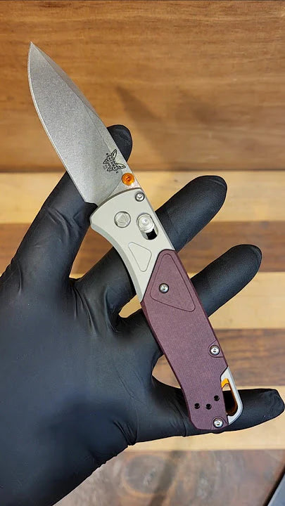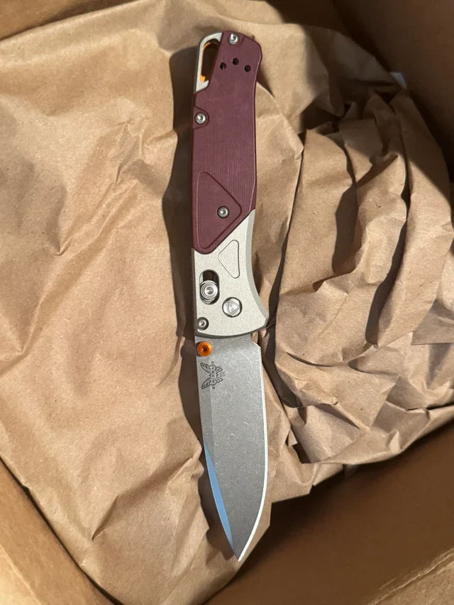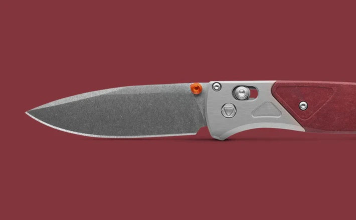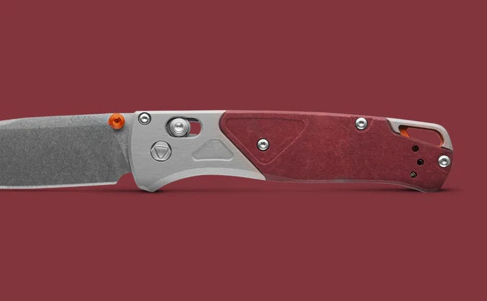 The 535-09 Bugout® blends style and performance with its gray anodized aluminum bolster and Redstone Richlite onlay. Accented with orange anodized thumb stud and backspacer, it features a durable CPM-S90V steel blade and a lightweight, compact design perfect for EDC. Over time, the Richlite handle develops a unique patina, making each tool one-of-a-kind.