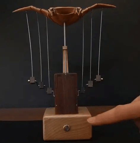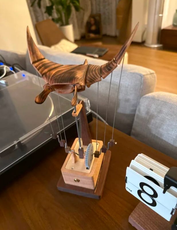 Inside, precise wooden gears create a natural, rhythmic glide — almost like watching it fly underwater.