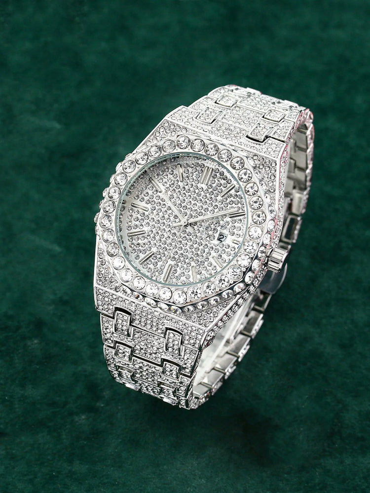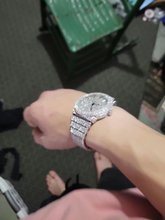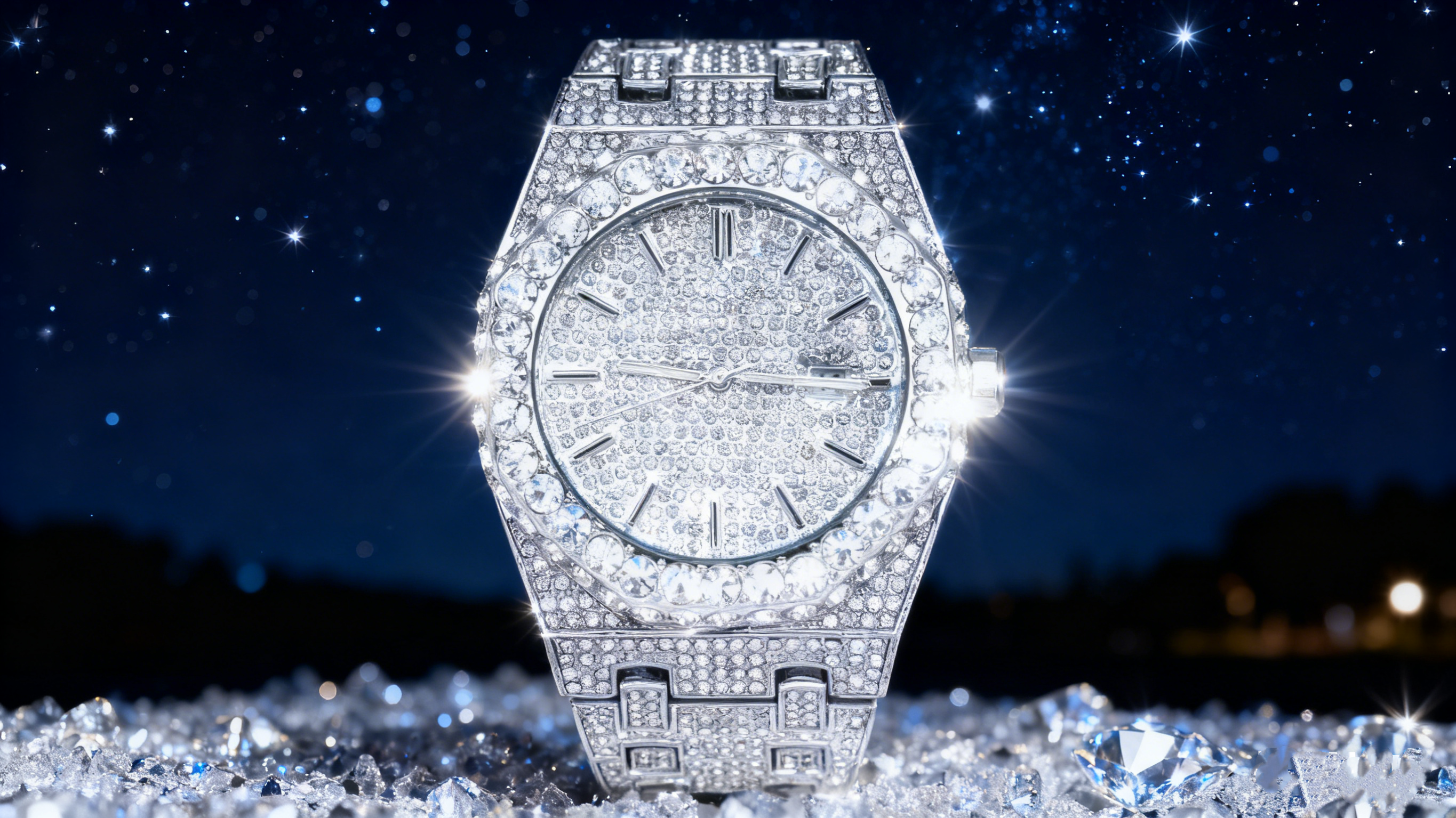 Every inch is flooded with meticulously set stones, catching light from every angle for a blinding VVS-like brilliance. It doesn’t tick quietly—it speaks loudly without a word.