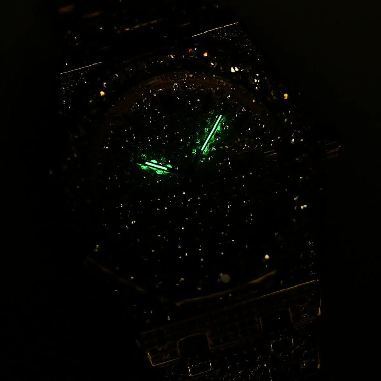 When the lights go out, your moments keep glowing. The luminous hands shine alongside the icy stones, ensuring you can read every second clearly—because even in the dark, your time deserves to sparkle.