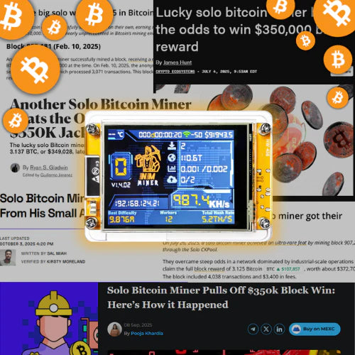 The One Shot Miner is a plug-and-play Bitcoin mining device that runs automatically, generating new “lottery tickets” every 10 minutes for the full Bitcoin block reward — 3.125 BTC (≈ $350,000). No setup, no effort — just 24/7 mining that quietly stacks your chances over time.