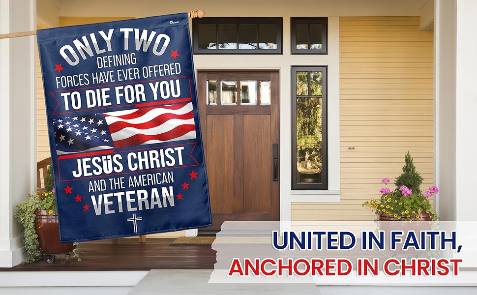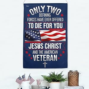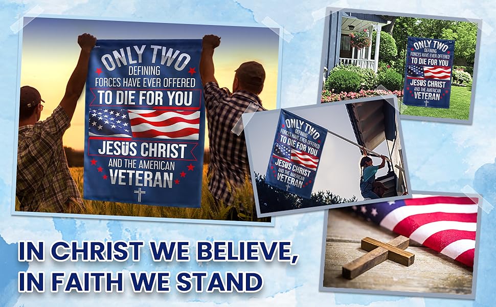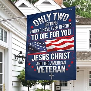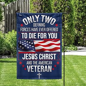 The garden flag is thoughtful with the quote “Only Two Defining Forces Have Ever Offered To Die For You Jesus Christ And The American Veteran”, the image of an American flag, and the symbol of the Christian cross. This flag clearly emphasizes the important roles of Jesus Christ and Veterans in our lives. They are the only forces that sacrifice for us, giving us what we have today.